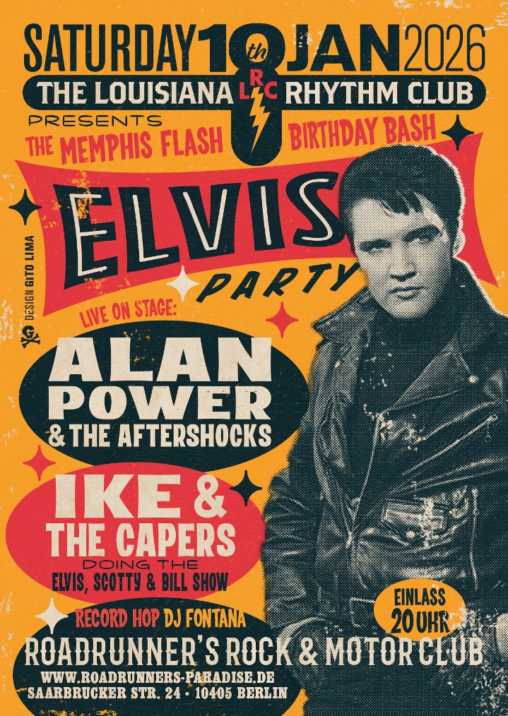 The Louisiana Rhythm Club ehrt diesen großartigen Musiker jedes Jahr mit einer krachenden Geburtstagsfeier. Auf der Bühne werden Musiker aus der Königsliga der europäischen Rock ’n‘ Roll/Rockabilly Szene aufeinandertreffen, für den Elvis eine besondere Inspirationsquelle, in deren musikalischen Schaffen. Für die kommende Tribute Feier wird ein Generationswechsel in die Wege geleitet. Seit der Gründung 2022 zieht die Band Alan Power & The Aftershocks aus Irland viel Aufmerksamkeit auf sich. Die 4 Musiker, die gerade aus ihren Teenagejahren raus sind, haben eine schwindelerregende Karrierestart hinter sich. Sie standen bereits auf Bühnen von renommierten Rock ’n‘ Roll Festivals in ganz Europa. Ihre Bühnenpräsenz kommt sehr überzeugend, wild und authentisch. Da gibt es deutliche Parallele zu dem Blitz aus Memphis.