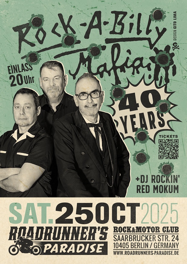 Die Rockabilly Mafia ist Legende und Phänomen: Seit 40 Jahren rockt sich die Band über Bühnen in halb Europa mit ihrer ganz eigenen Musik für die Ewigkeit. Purer Rockabilly ohne Retrokitsch mit deutschen und englischen Texten, manchmal aber auch beinah zarte Titel über die vergänglichen Dinge des Lebens, und zu all dem lässt sich auch noch so richtig klasse abfeiern. Die Zahl der ausschließlich selbst komponierten und getexteten Stücke geht in die Hunderte, bisher entstanden seit 1985 so 18 komplette Alben, Nummer 19 mit dem bezeichnenden Titel >Ewigkeit< ist grade in der Mache. Wer die Gelegenheit hat, diese Band live erleben zu können, sollte das auf keinen Fall verpassen: Authentische Urgestein-Rock ’n‘ Roller von altem Schrot und Korn, die so manche junge Nachwuchskapelle richtig alt aussehen lassen!